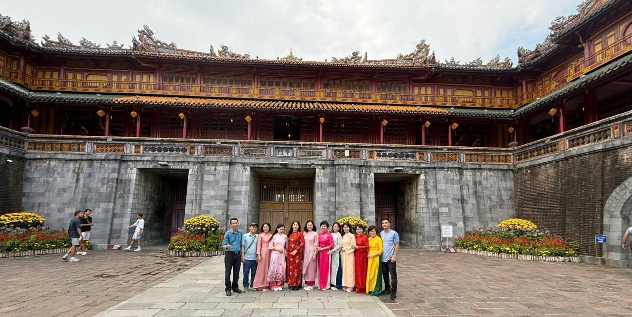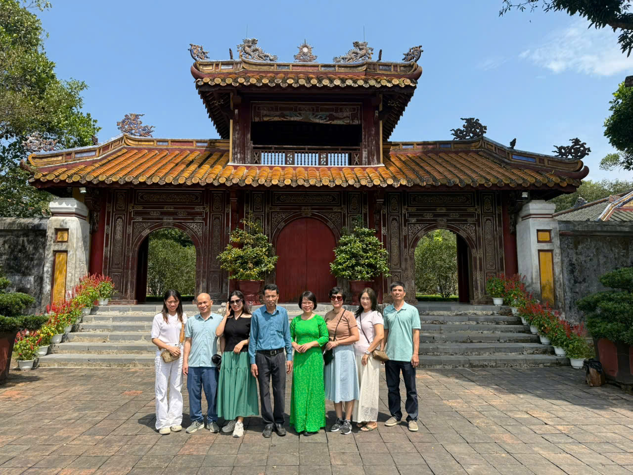 Đặc biệt, đoàn đã đến tham quan Trường Quốc Học Huế, ngôi trường giàu truyền thống lịch sử, nơi từng đào tạo nhiều nhân tài cho đất nước và cũng là nơi Chủ tịch Hồ Chí Minh đã từng học tập trong những năm tháng tuổi trẻ. Tại đây, các thành viên trong đoàn đã chụp ảnh lưu niệm, ghi lại những khoảnh khắc ý nghĩa của chuyến nghiên cứu thực tế chuyên môn, đồng thời bày tỏ sự trân trọng đối với truyền thống hiếu học và tinh thần yêu nước của các thế hệ đi trước.